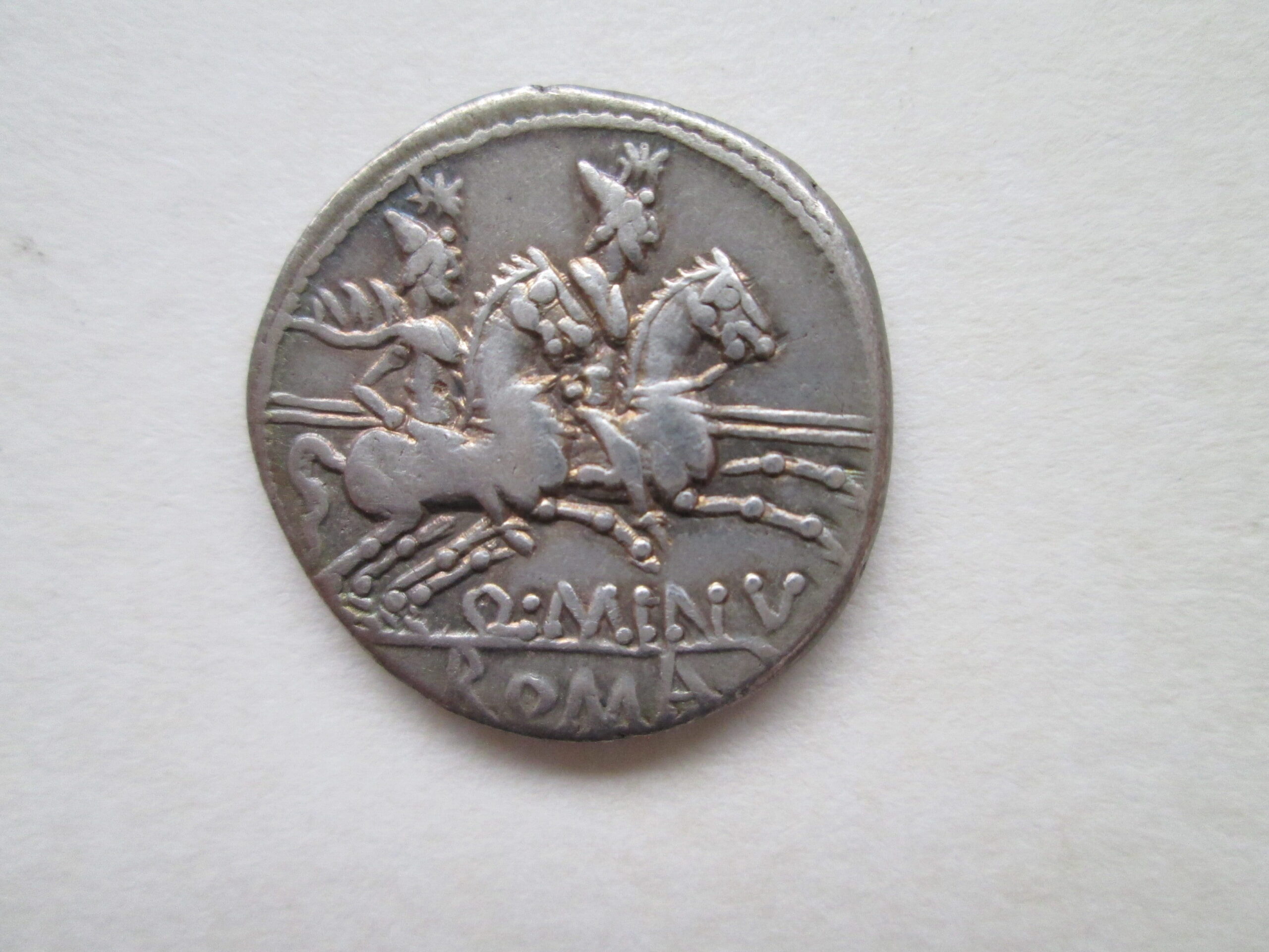 Na fot. 6 pokazano denaru Republiki Rzymskiej, wybitego w mennicy w Rzymie. Aw: Głowa Romy w hełmie, za nią litery RVF, pod podbródkiem X. Rw: Dioskurowie ( bliźniacy Zeusa ) na koniach, poniżej Q.MINV, w odcinku ROMA
