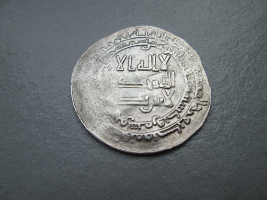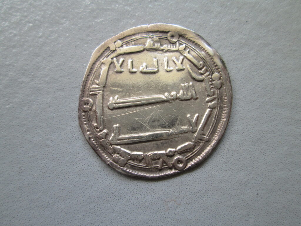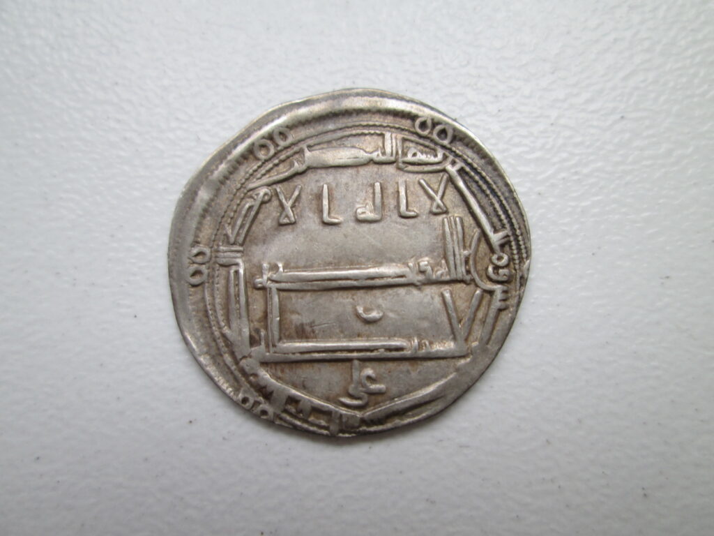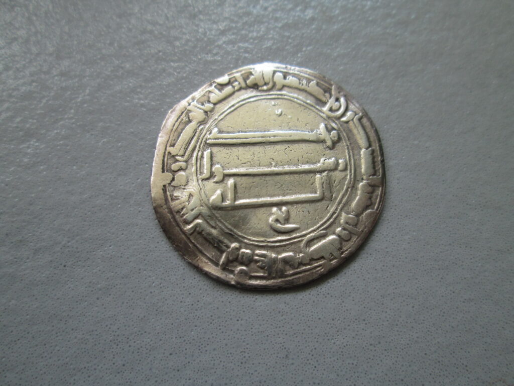 Fot. 4. Imperium arabsko – muzułmańskie, kalifat Bagdadu, kalif al Mansur z rodu Abbasydów 754 – 775 r., dirhem 769 r., mennica Medina al – Salam ( Bagdad ), 25 mm, 2,84g.