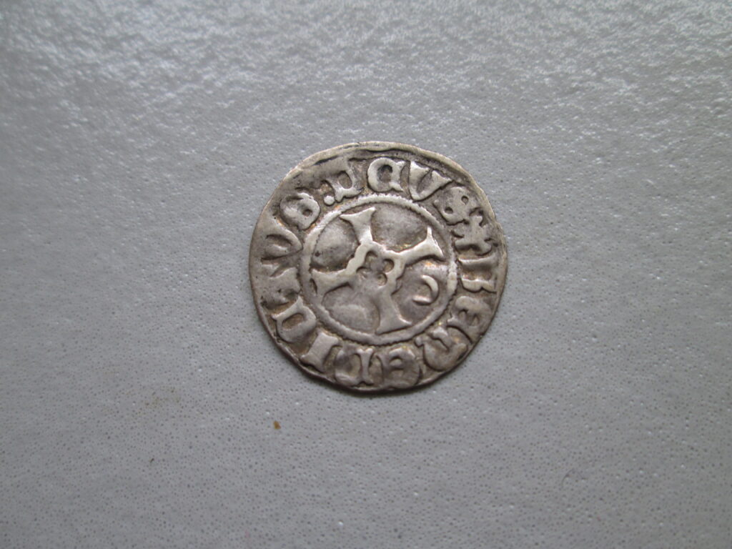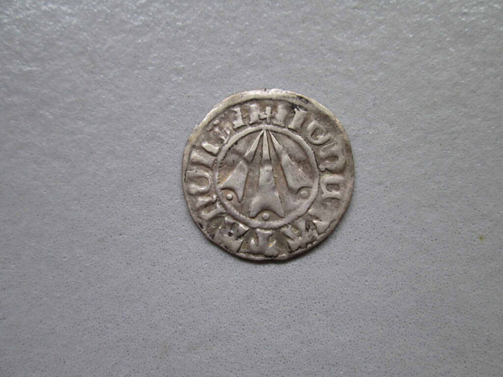 Tąglim – miasto, wit ok. 1381 r., srebro, 18,9 mm, 1,15g. Aw.: Grot strzały, pod jej ramionami kulki, MONETA TANGLUM Rw.: Krzyż z rozetą w środku, w polu półksiężyc, BENEDICTUS DEVS