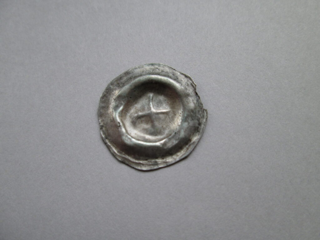 Fot. 13. Państwo Krzyżackie ( lub polskie naśladownictwo ), brakteat, 1265 – 1275, śr. 16,5 mm, 0,2g. Aw. Krzyż nitkowy.