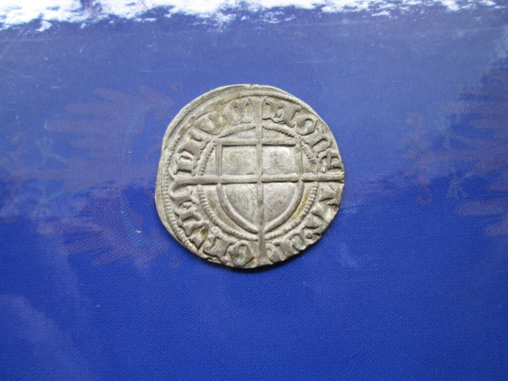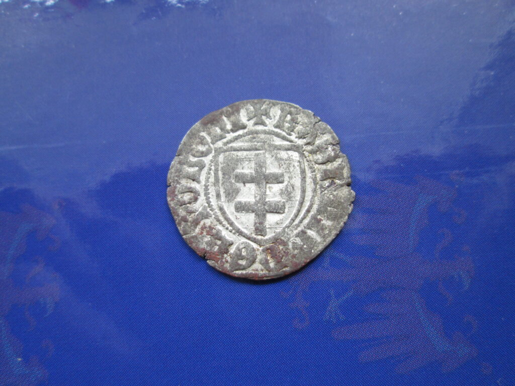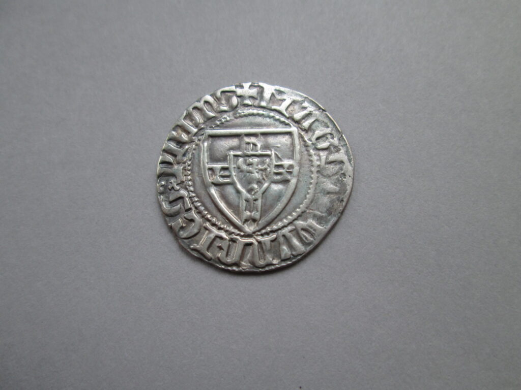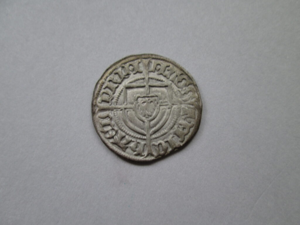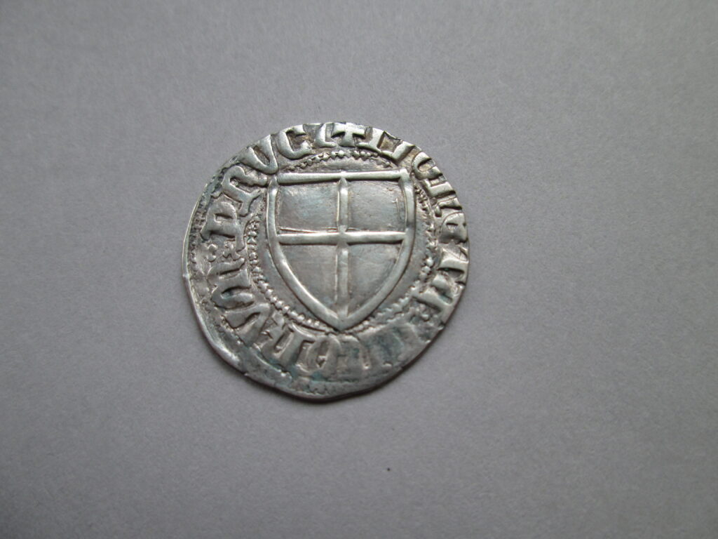 Fot. 18. Państwo Krzyżackie, Wielki Mistrz Winrych v. Kniprode, szeląg 1380 – 1382, mennica Toruń? Gdańsk? , śr. 20,5 mm, 2,6g. Aw.: MAGST WVNRICS PRIMS Rew.: MONETA DNORVM PRVCI