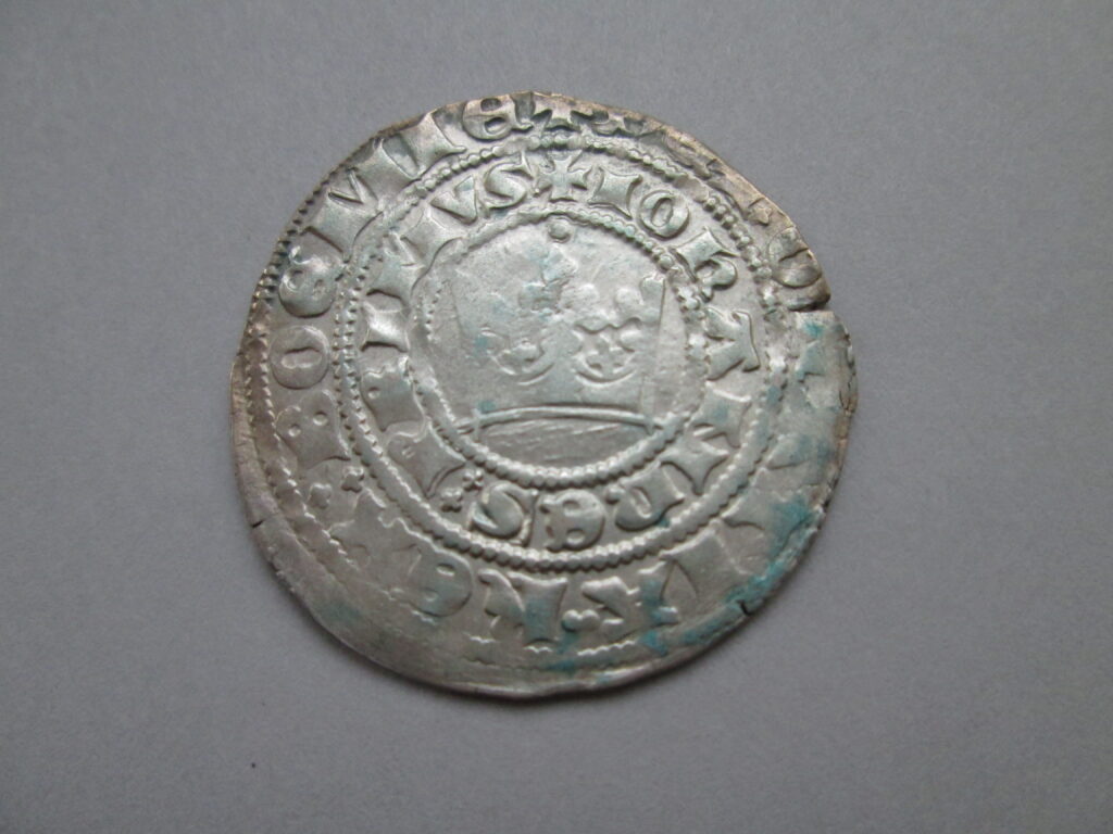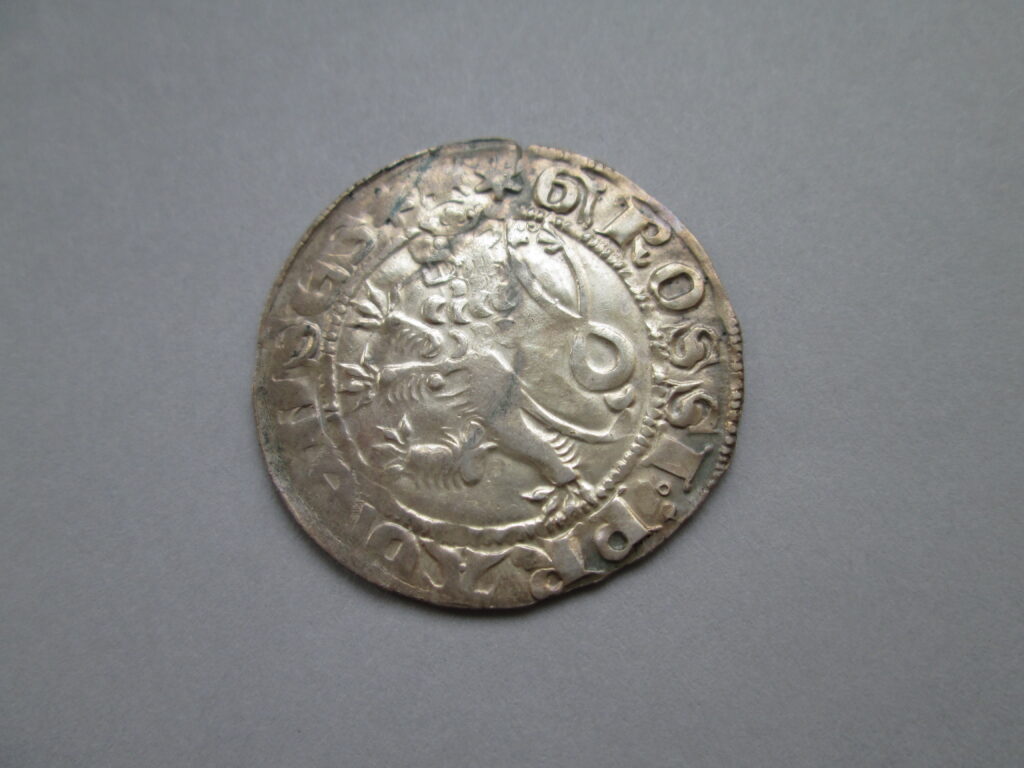 Fot. 17.Królestwo Czeskie, Jan I Luksemburski, grosz praski, mennica Kutna Hora 1310 – 1346, śr. 28 mm, 2,4 – 2,9g. Aw.: Korona, otok wewnętrzny: JOHANNES PRIMVS, otok zewnętrzny:DEI GRACIA REX BOEMIE. Rew.: Lew, GROSSI PRAGENSES.