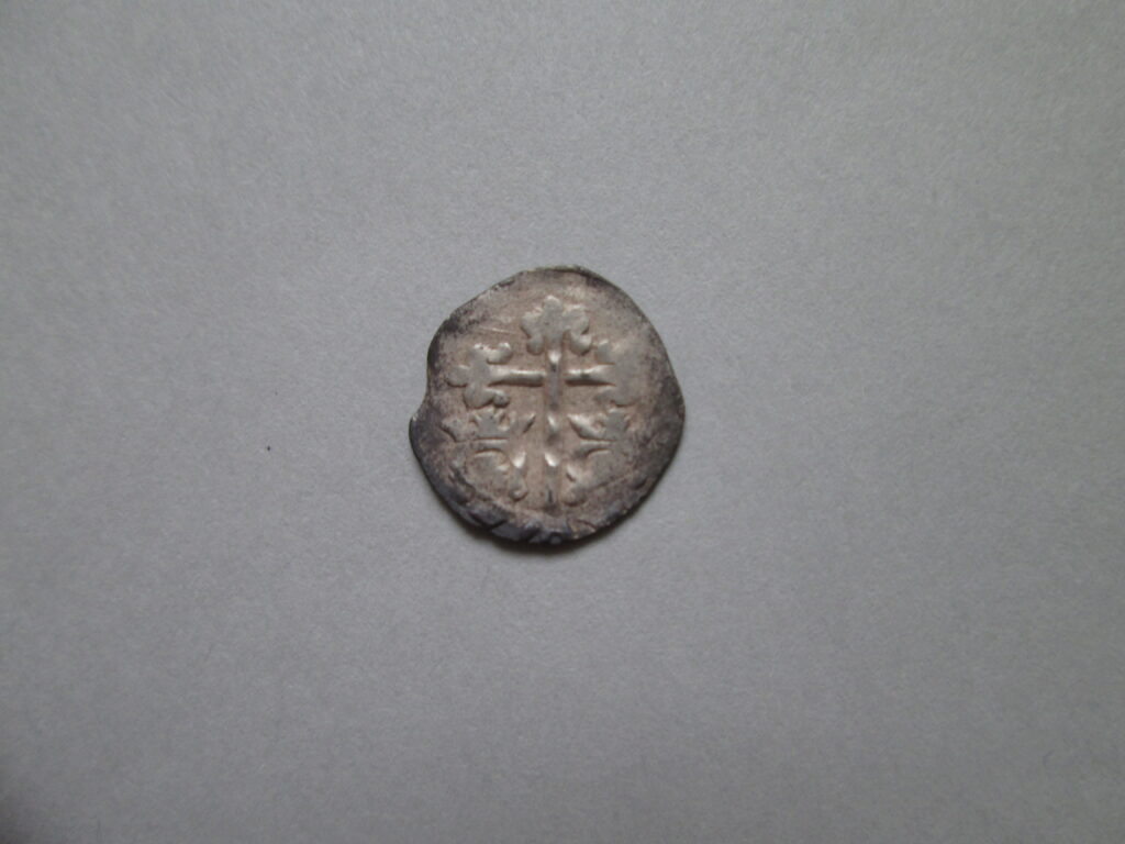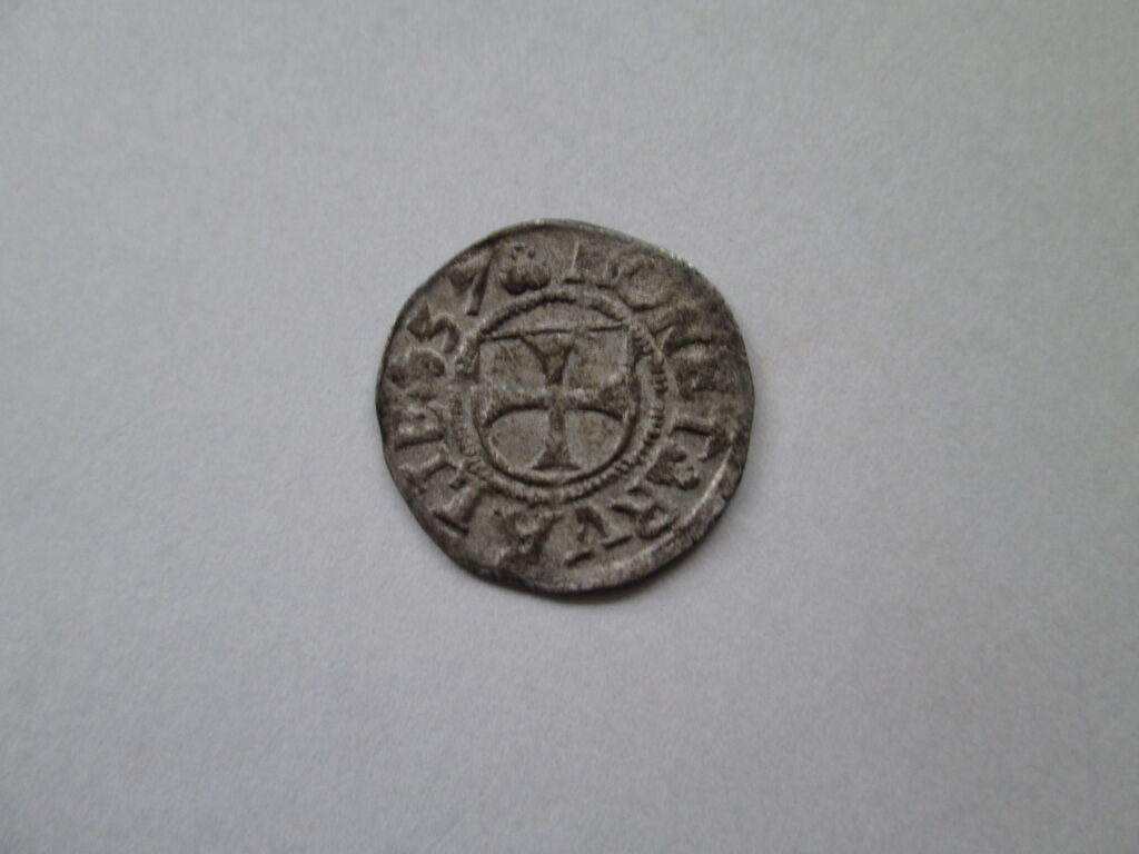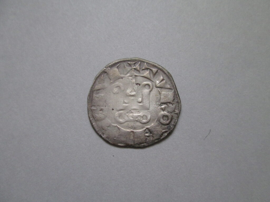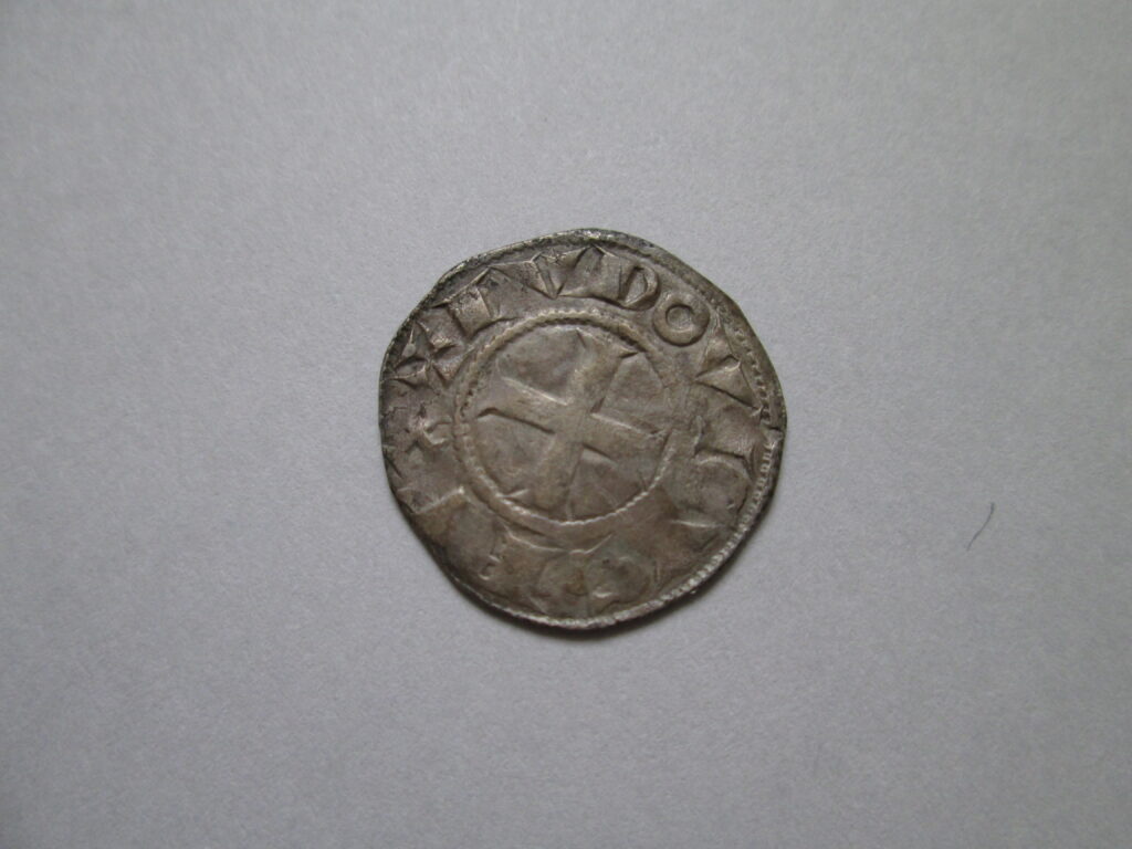 Fot. 16. Francja, Ludwik II, denar, mennica Tours 1223 – 1226, śr. 18mm. Aw.: Krzyż, LUDOVICUS REX. Rew. TURONI CIVI(TAS), zamek? Katedra?