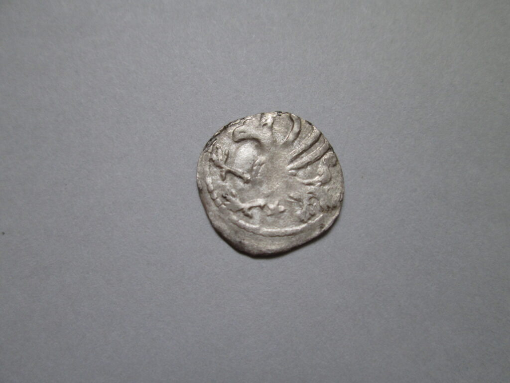 Fot. 19. Pomorze Zachodnie, mennica Szczecin, denar śr. 11 mm, ok. 0,25g. Aw.: Gryf kroczący w lewo. Rew.: Brama miejska, w wejściu hełm z pióropuszem.