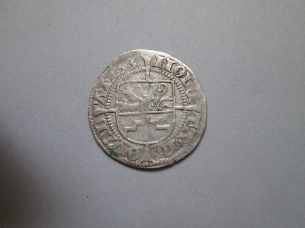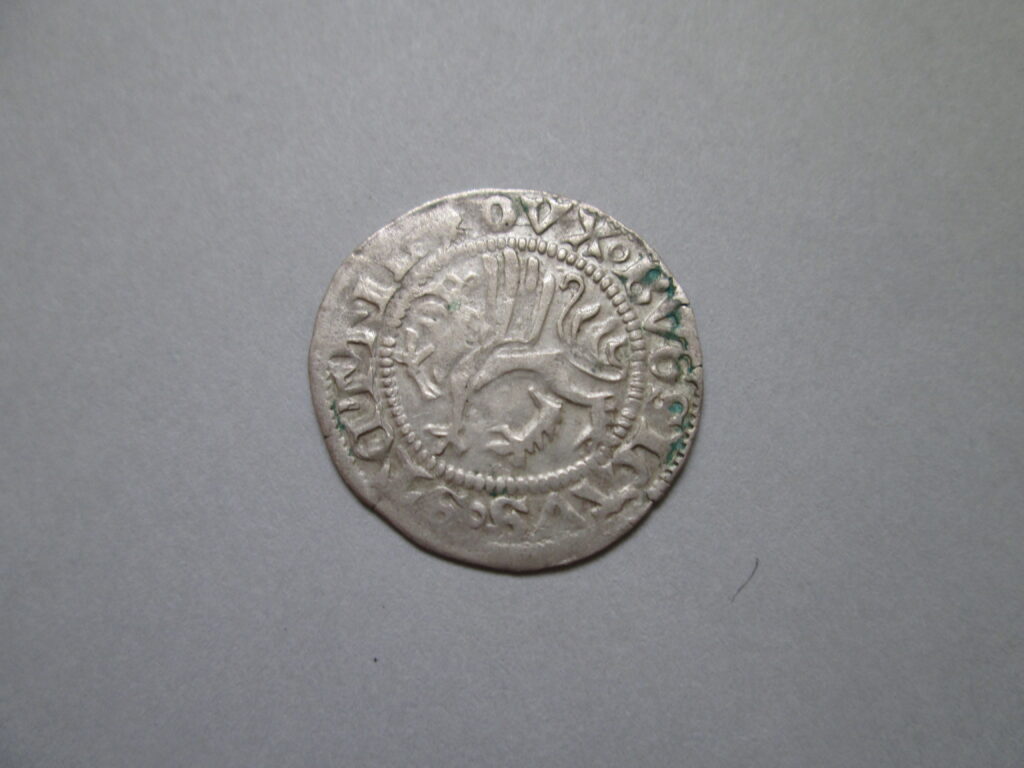 Fot. 25. Pomorze Zachodnie, Bogusław X, szeląg, mennica Dąbie 1493, śr. 21 mm, 1,39g. Aw.: Gryf, DVX BVGSLAVS STETIN Rew.: Rugijska tarcza herbowa, MONETA NOVA DAM 93