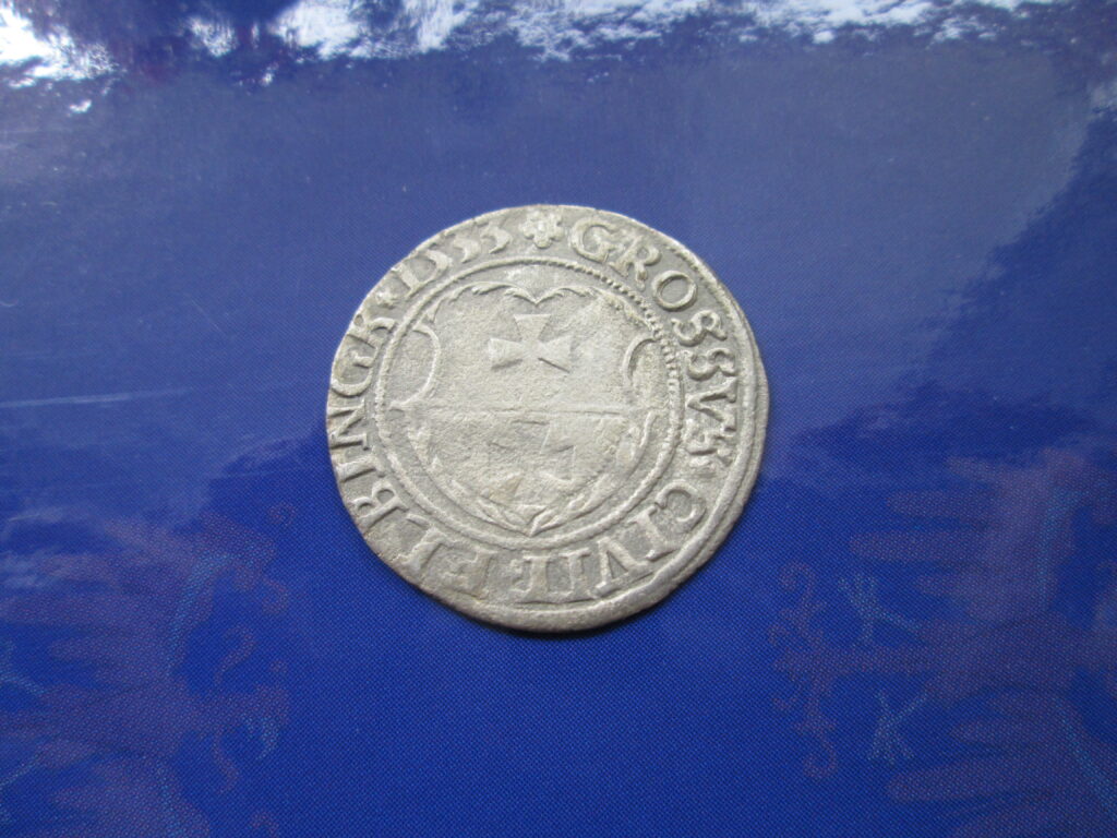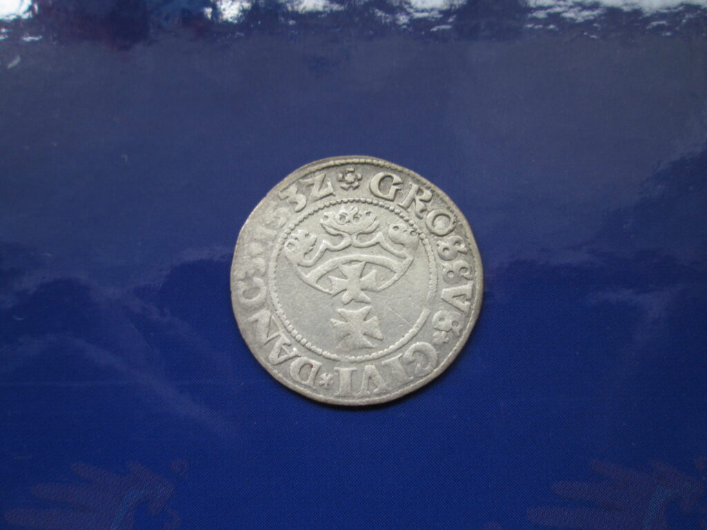 Fot. 26. Polska, Prusy Królewskie, Zygmunt I Stary, grosz, mennica Gdańsk 1532, śr. 22 mm, ok. 2g. Aw.: Popiersie króla, SIGIS I REX PO DO TOCI PRVS Rew.: Herb Gdańska GROSSVS CIVI DANCZ 1532