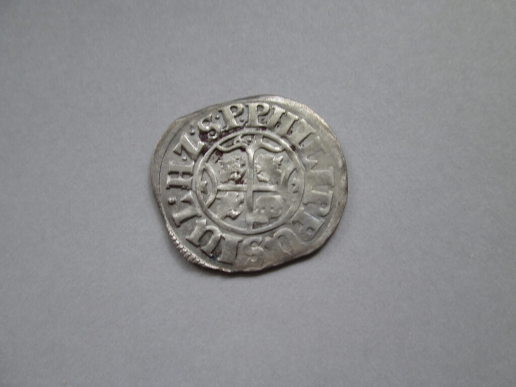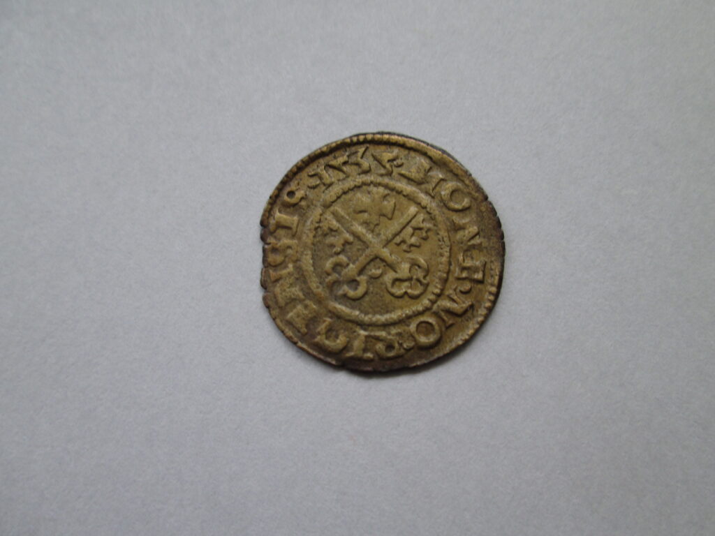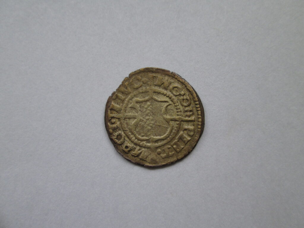 Fot. 28. Inflancki Zakon Kawalerów Mieczowych, wielki mistrz Walter von Plettenberg, szeląg, mennica Ryga 1535, śr. 18 mm Aw.: Herb Zakonu ( krzyż nad mieczem w tarczy ), WO DE PLET MAGI LIVO Rew.: Herb Rygi, MONE NO RIGENSIS 1535