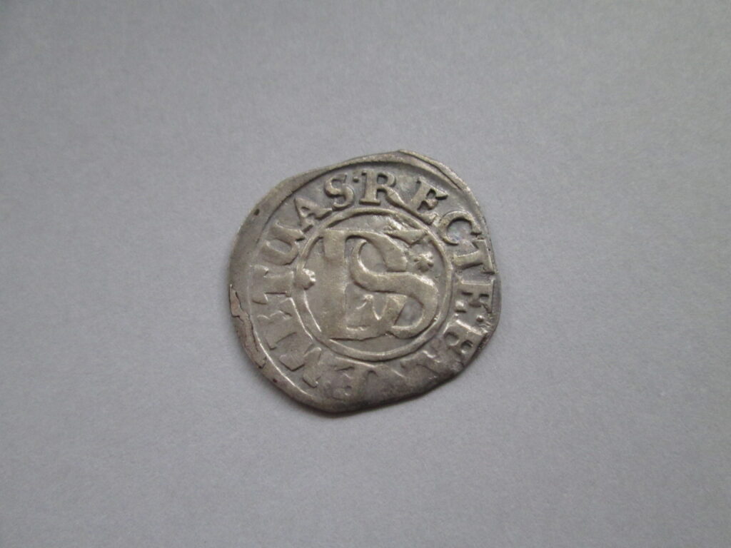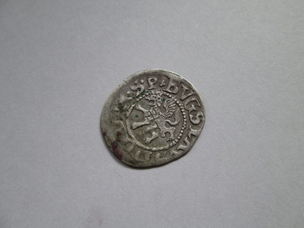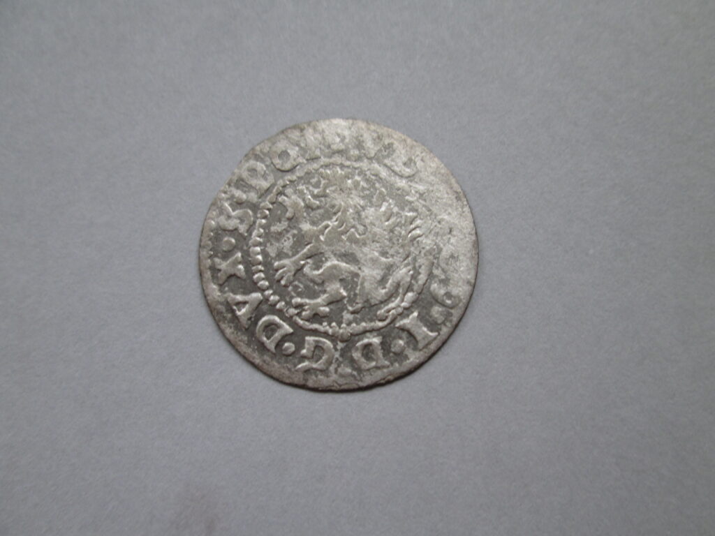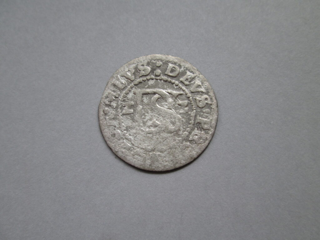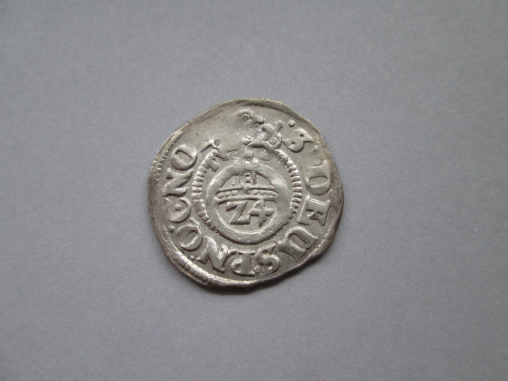 Fot. 34. Pomorze Zachodnie, Bogusław XIV, szeląg podwójny, mennica Szczecin 1621, śr. ok.20 mm, 1,6g Aw.: Gryf, BVGSLAVS. D.G.DVX. S.P Rew.: Monogram DS z – 1, DEVS ADIVTOR MEVS