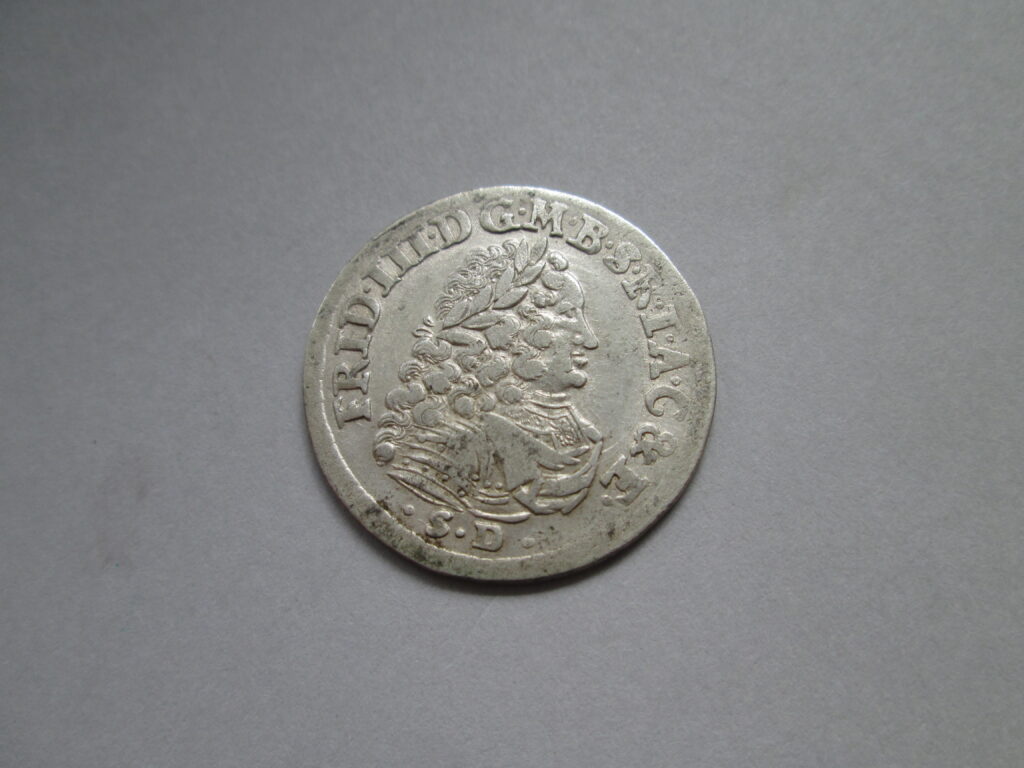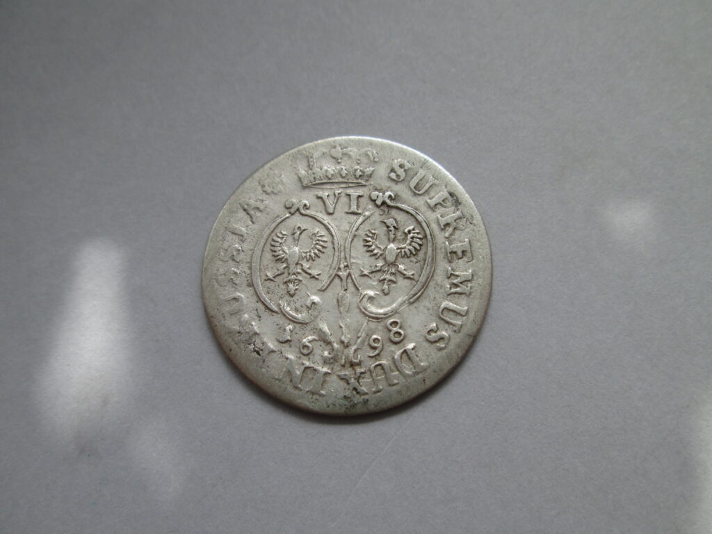 Na fot.35 pokazano już pruską monetę, brandenburskiego elektora, księcia Fryderyka III. Jest to szóstak z mennicy w Królewcu, z 1698 roku.
